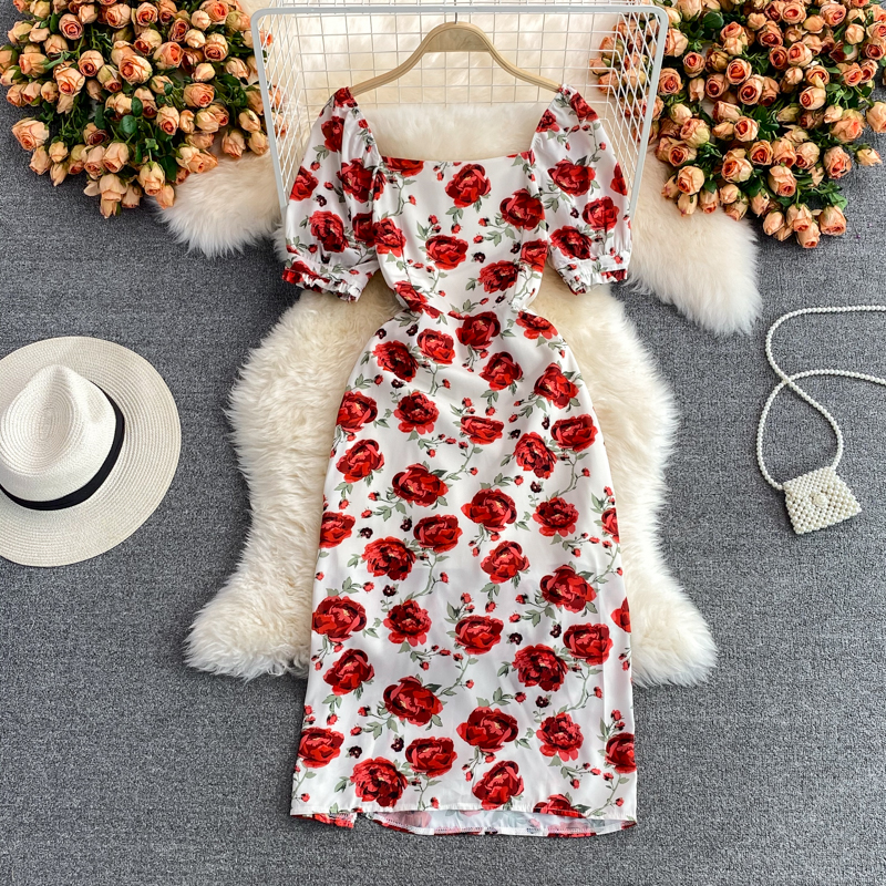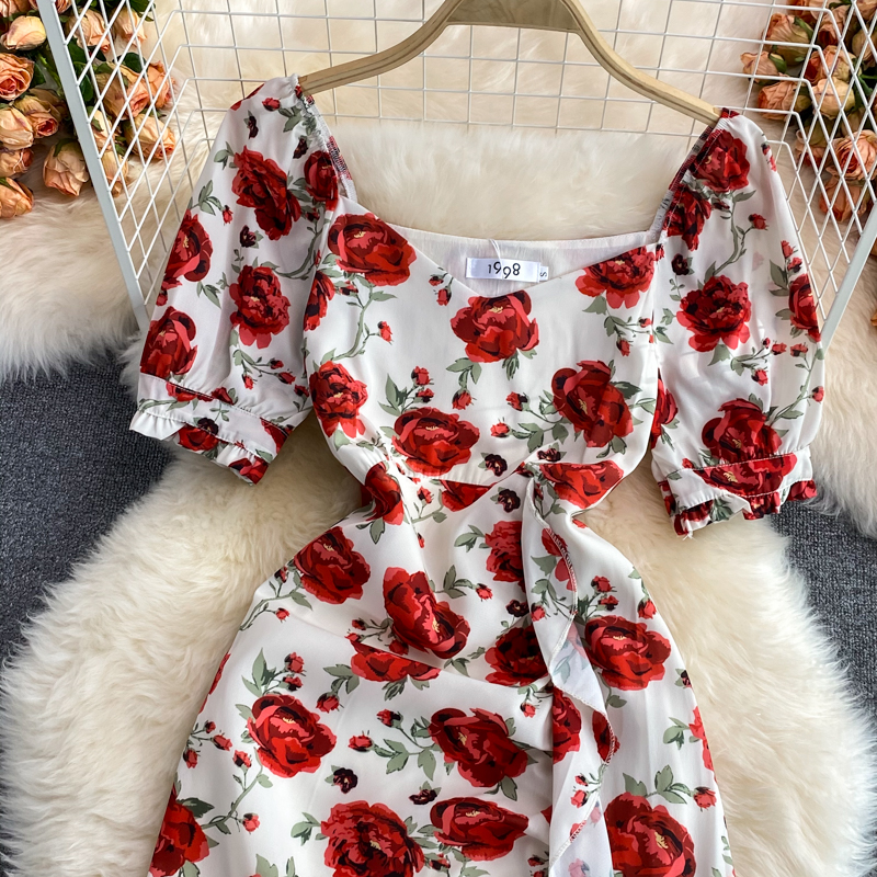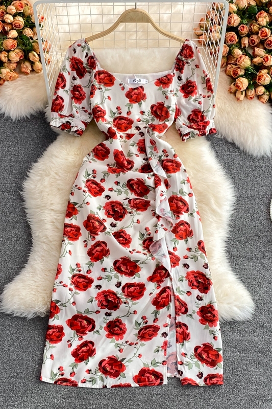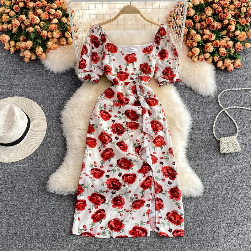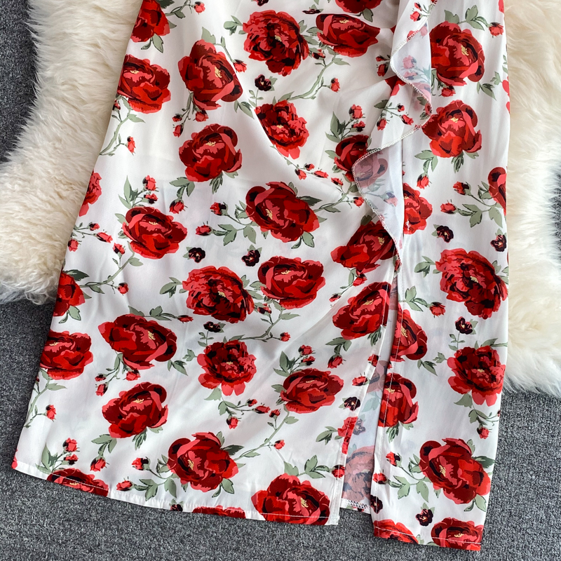 French Style Retro Kikyo Tea Dress Rose Dress Tight Waist Slimming Elegant Slightly Mature Style Split Floral Dress for Women