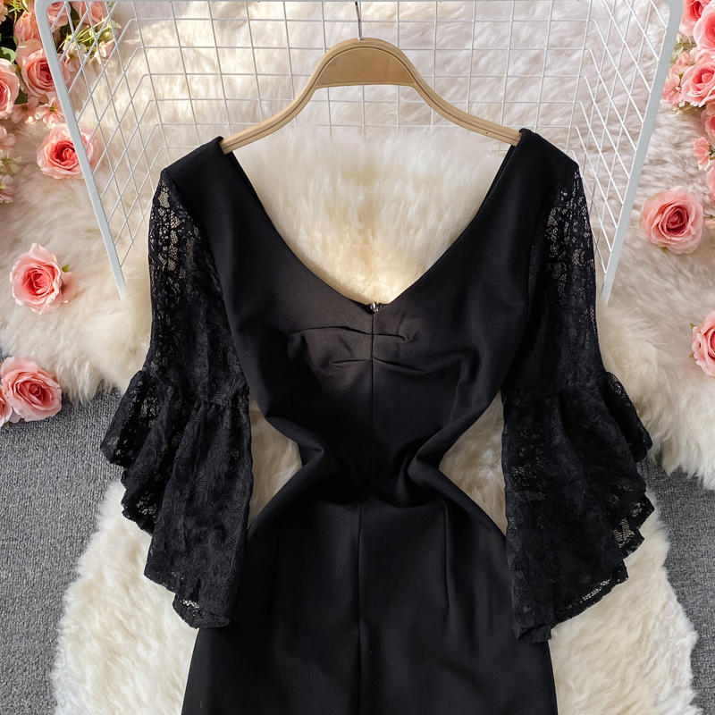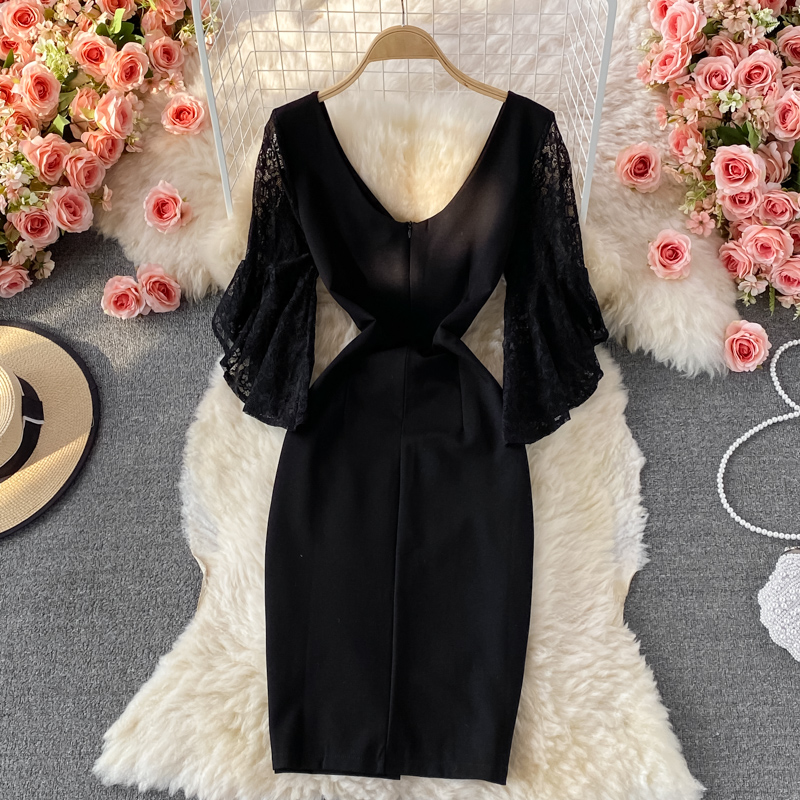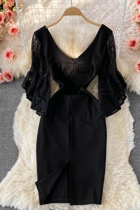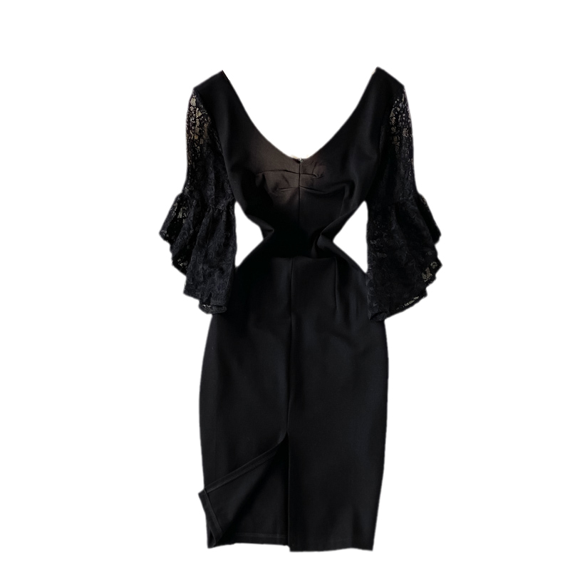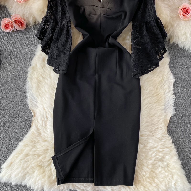 Cheap Dresses, Buy Quality Women’s Clothing Directly from China Suppliers:Autumn Korean Style New Sexy Lace Patchwork Flared Sleeves V neck Business Ol Temperament Split Sheath Dress