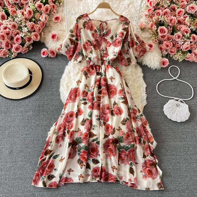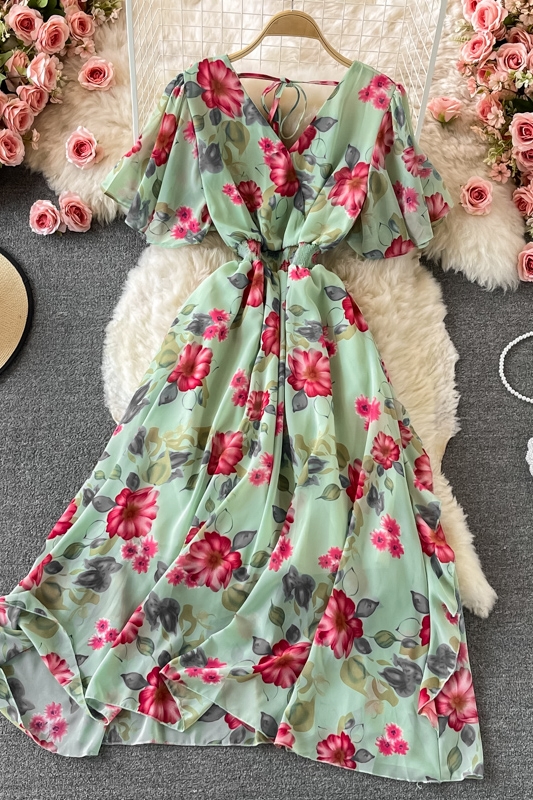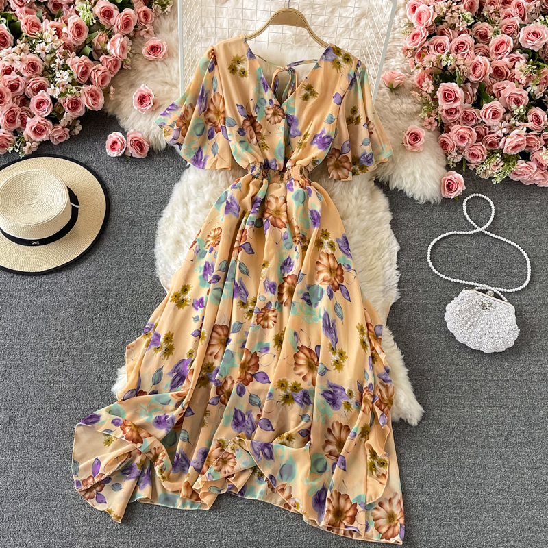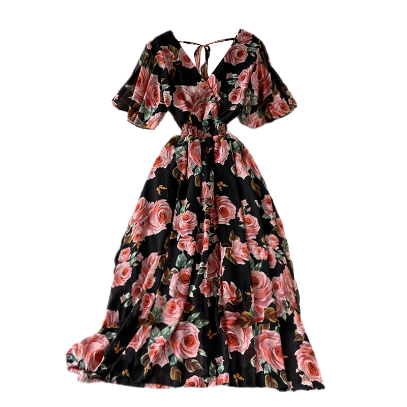 V-neck Backless Chiffon Dress Summer Goddess Temperament Elegant Printed Seaside Holiday Large Swing Dress