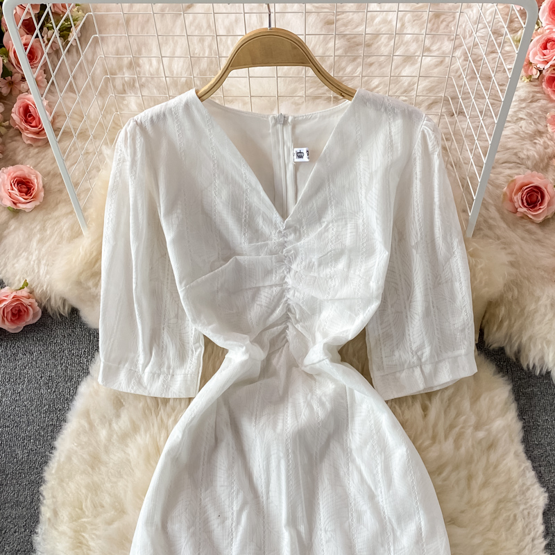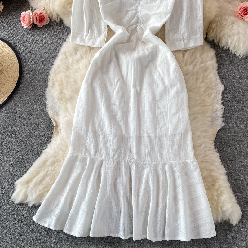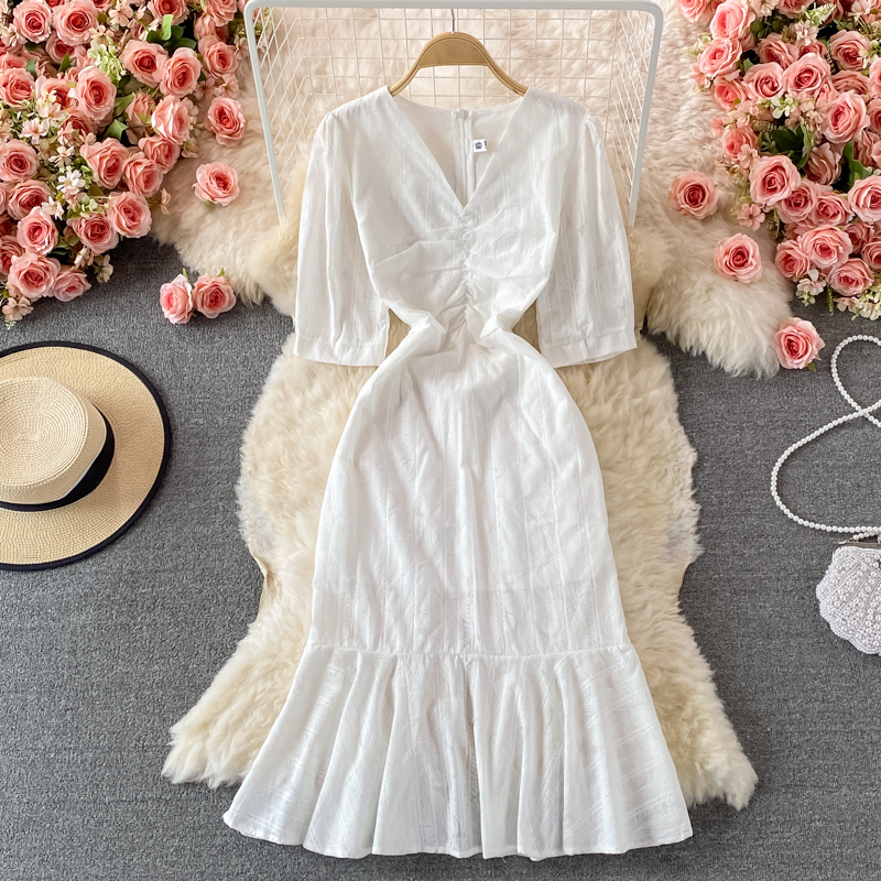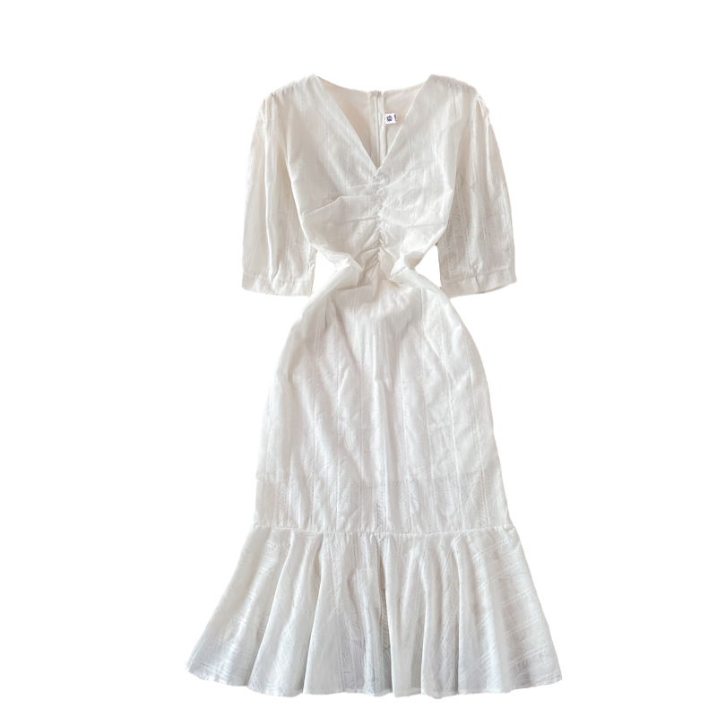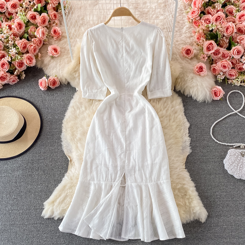 Elegant First Love White Slim Dresssummer New V-neck Waist-Controlled Slimming Sheath Fishtail Dress