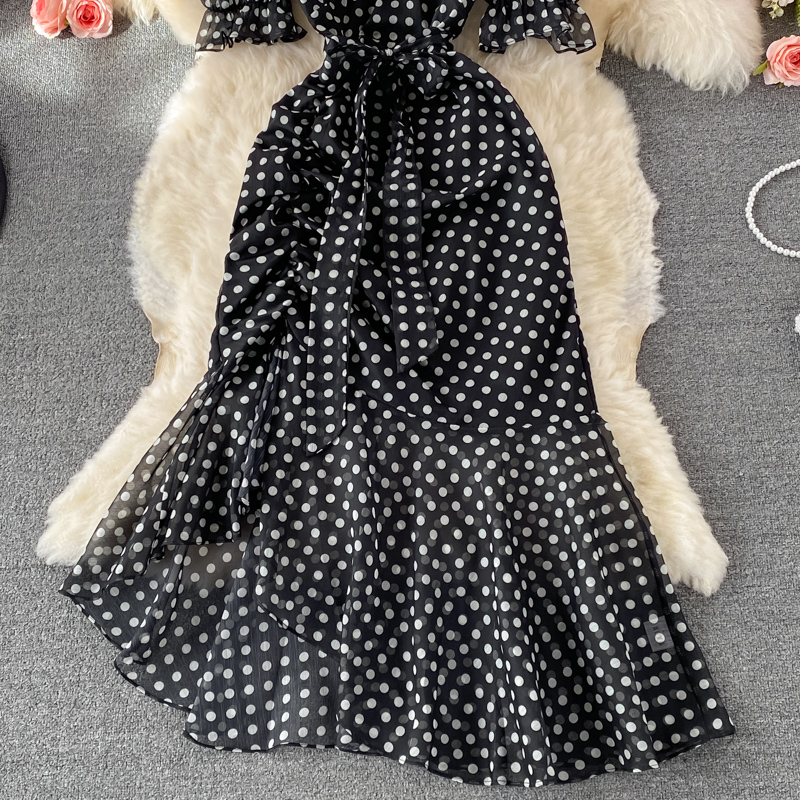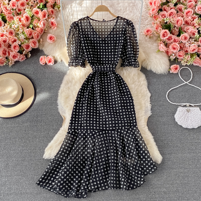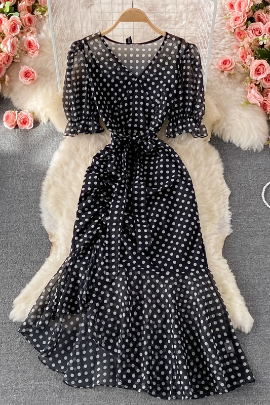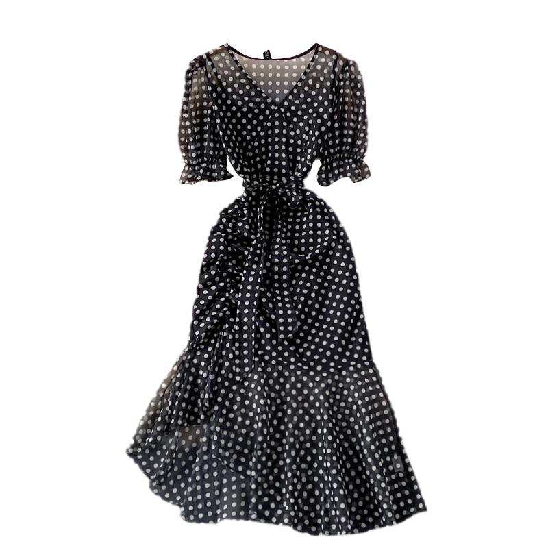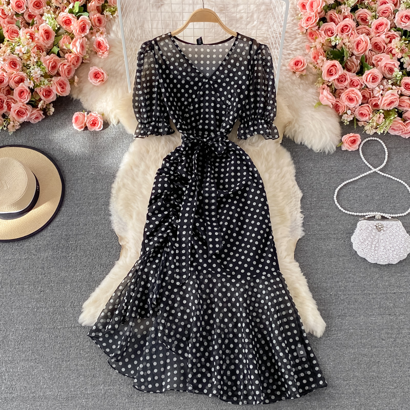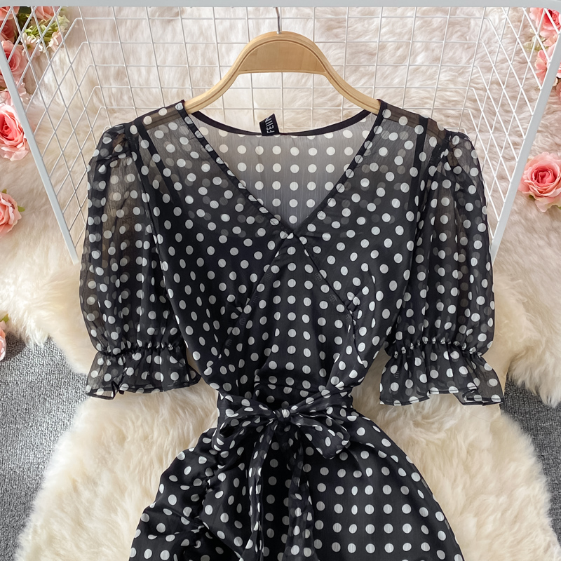 Summer New Elegant French Tight Waist Slimming Puff Sleeve V-Collar Polka Dot Chiffon Dress Sheath Dress