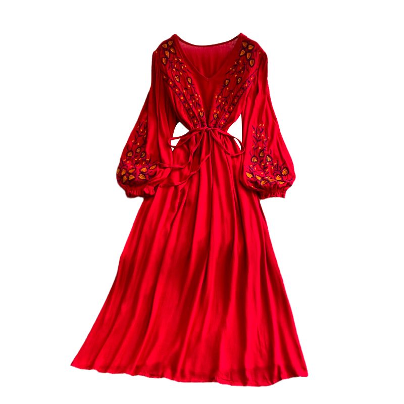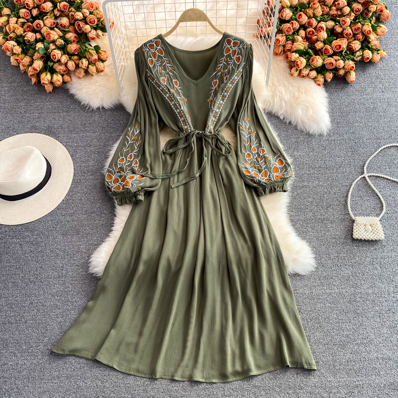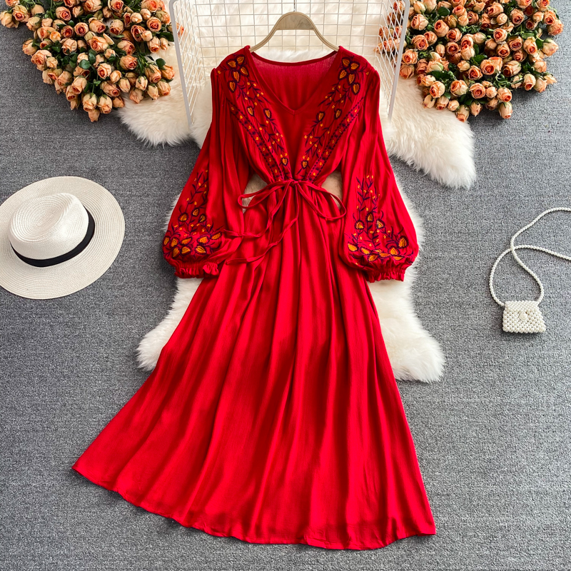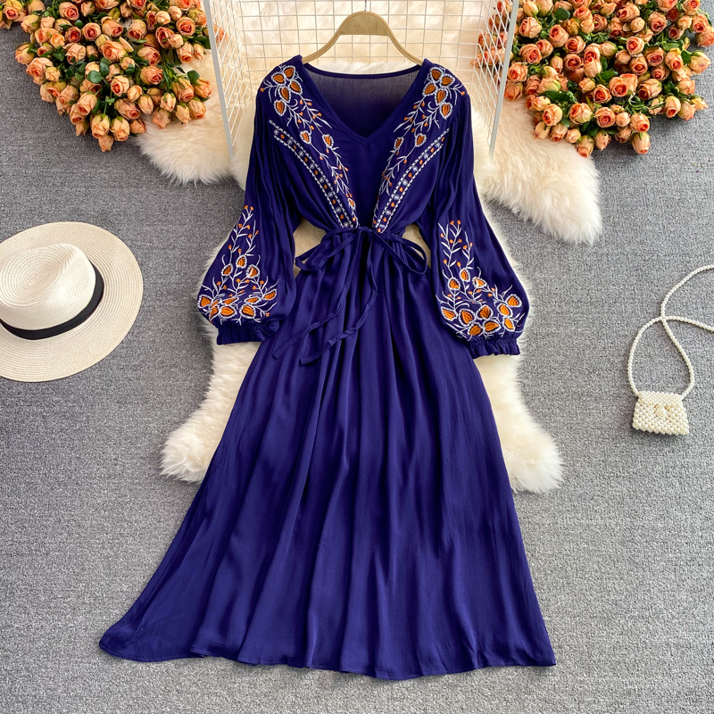 Cheap Dresses, Buy Quality Women’s Clothing Directly from China Suppliers:Ethnic Embroidery Temperament V neck Lace up Waist Controlled Slimming Trip Shoot Holiday Dress Puff Sleeve Swing Long Dress