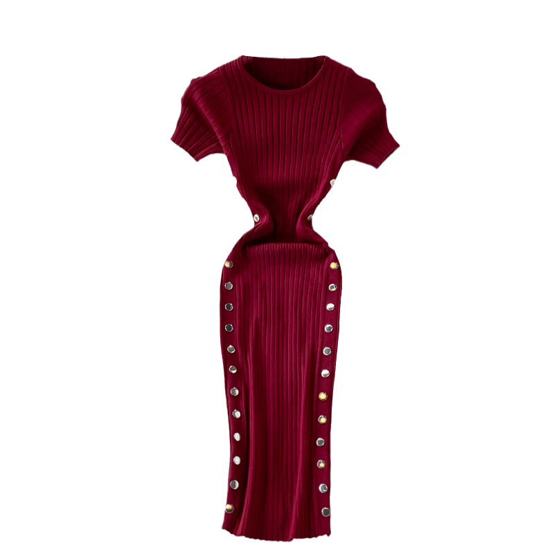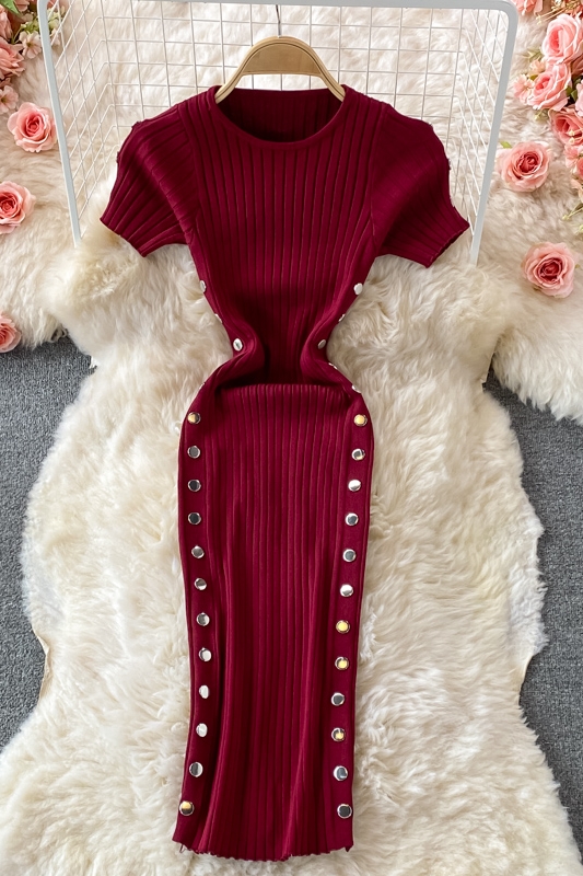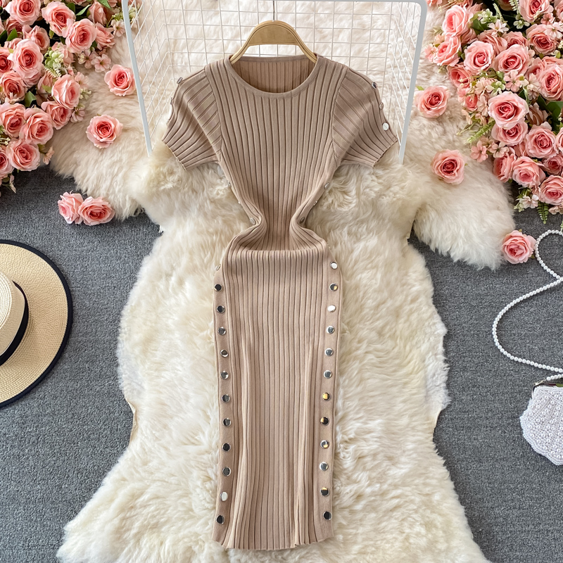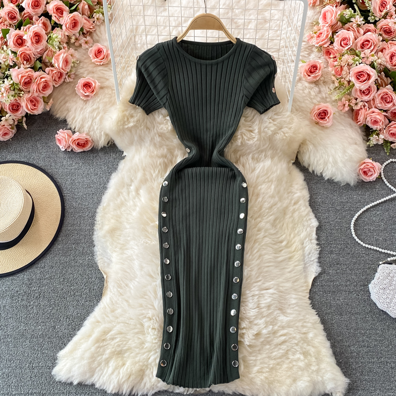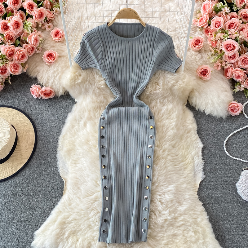 Cheap Dresses, Buy Quality Women’s Clothing Directly from China Suppliers:French Style Retro round Neck Short Sleeves Skinny Slimming Side Double Breasted Sheath Skirt Stretch Knitted Dress Summer