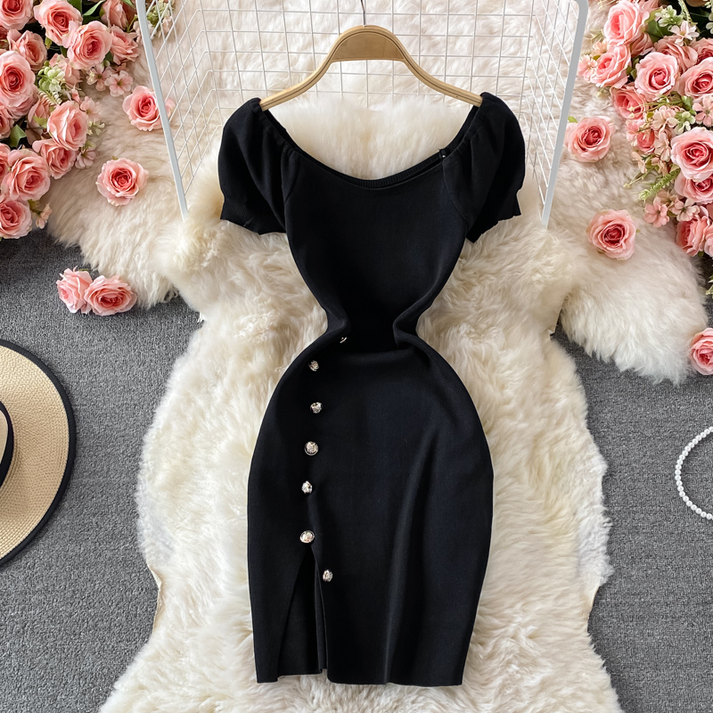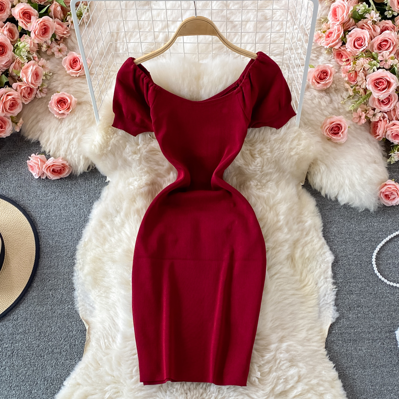 French Style Temperament Goddess Temperament Purple Square Collar Dress Summer New Sweet Slim Fit Puff Sleeve Slit Sheath Skirt