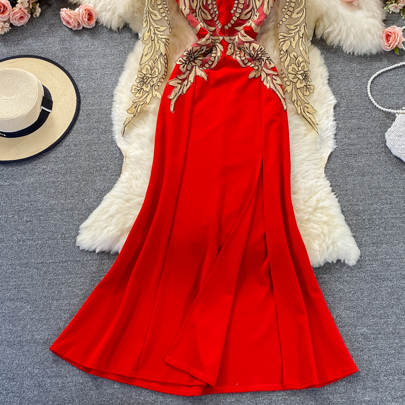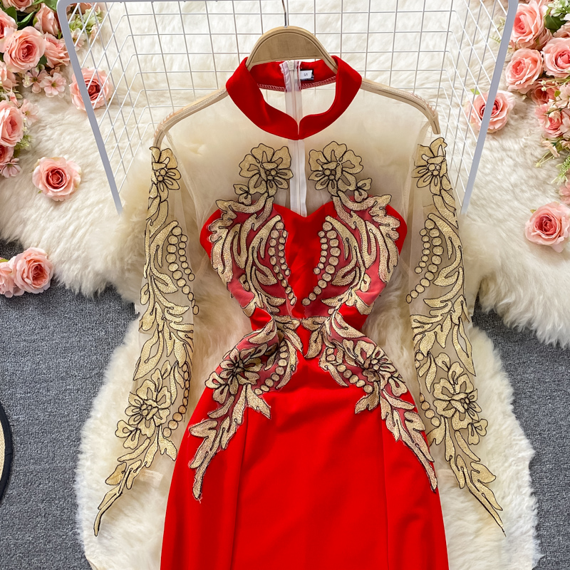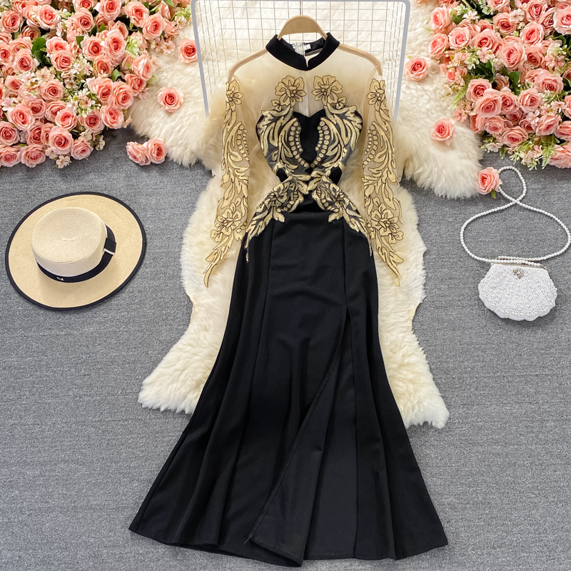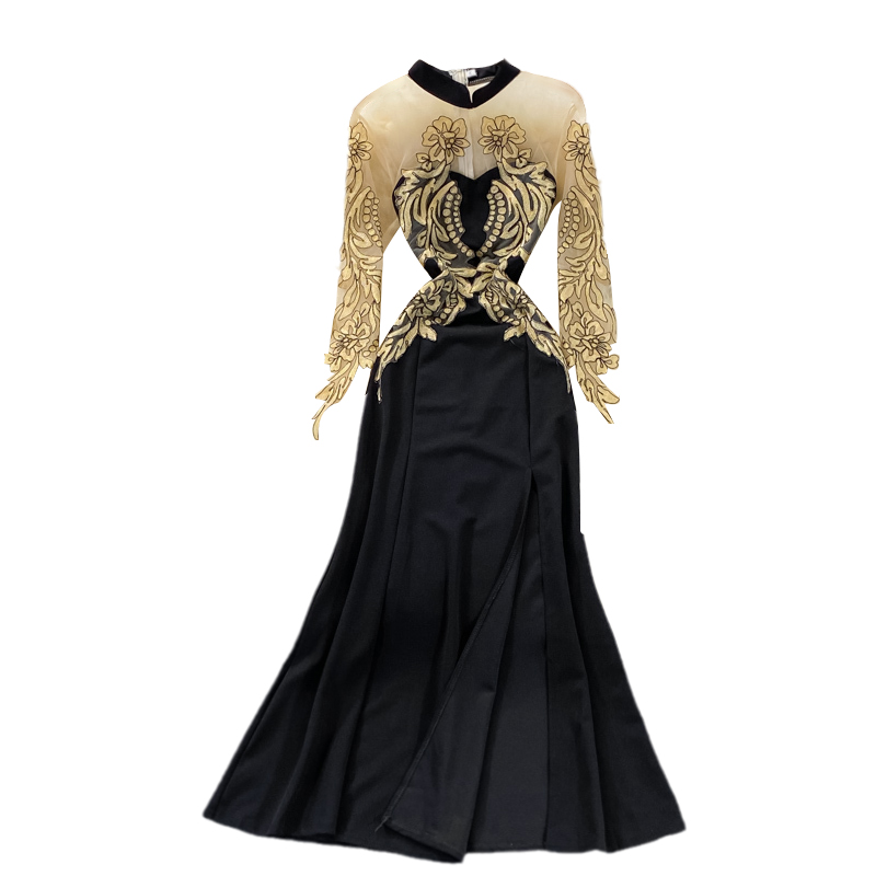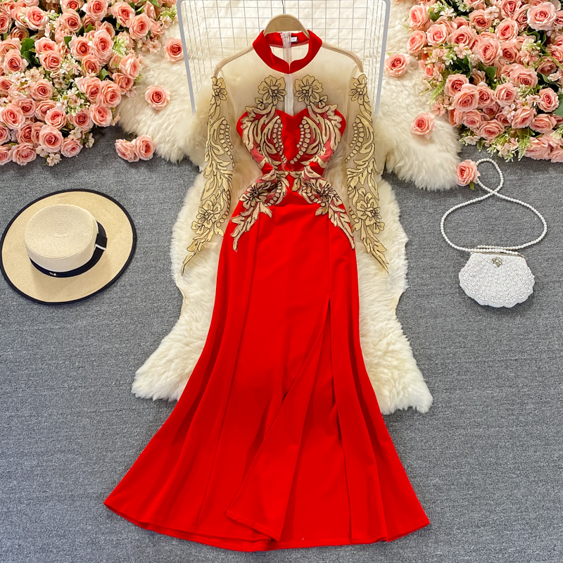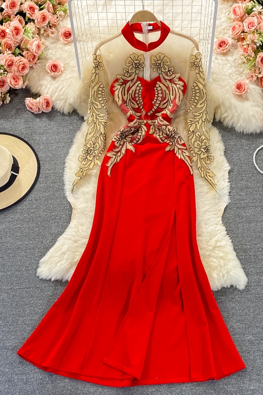 Cheap Dresses, Buy Quality Women’s Clothing Directly from China Suppliers:Autumn Sexy Modified Retro Cheongsam Gauze Stitching Long Sleeve Evening Dress Long Dress Stand Collar Split Dress
