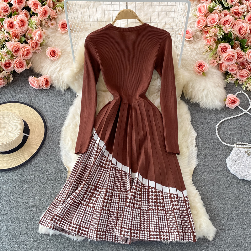 Match with Coat Woolen Skirt Autumn and Winter round Neck Plaid Patchwork Knitting Dress Mid-Length Pleated A- line Skirt