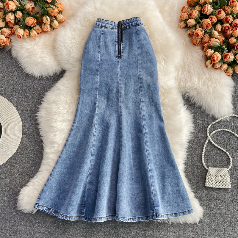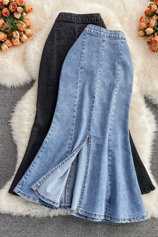 Denim High Waist Slit Skirt Women’s A- line Skirt Ruffled Mid-Length below the Knee Slim Fit Slimming Fishtail Hip Skirt