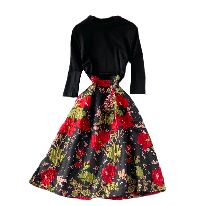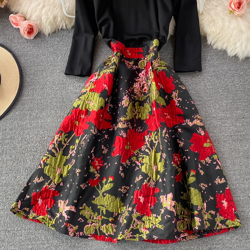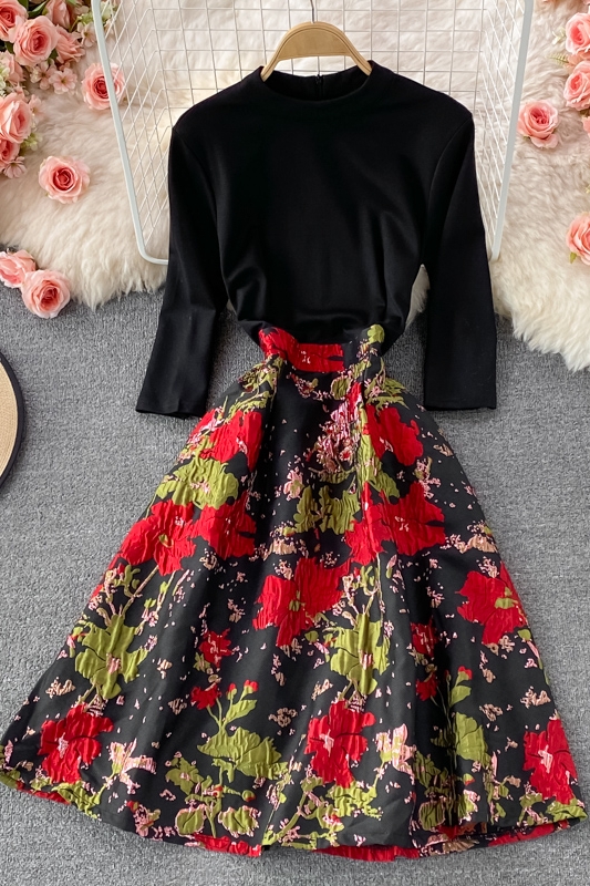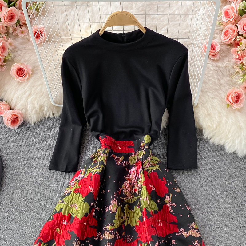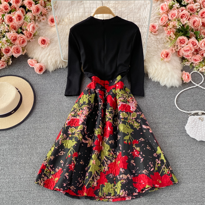 Feminine Dress Women's Autumn New Fashion Stitching Printing Gas Stand-up Collar Cinched Slim-Fit Mid-Length Dress