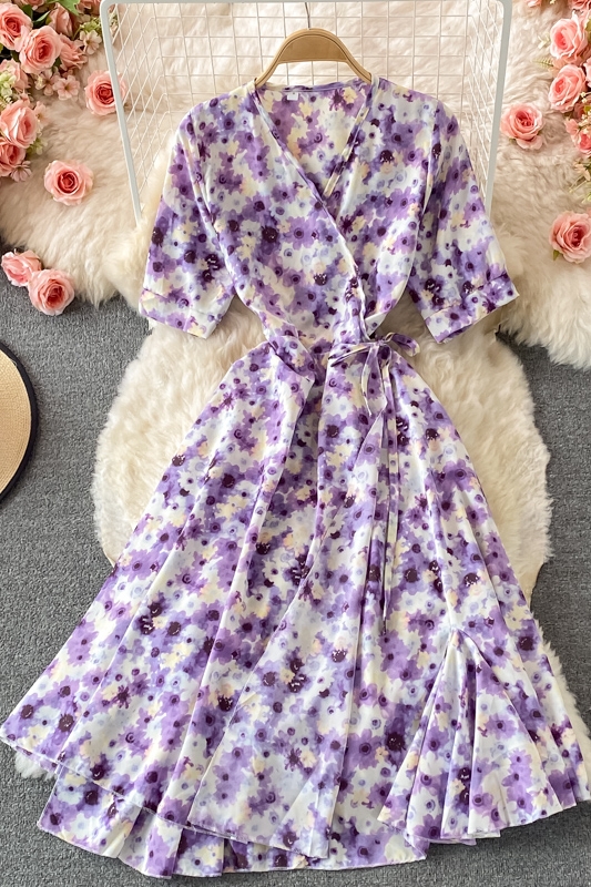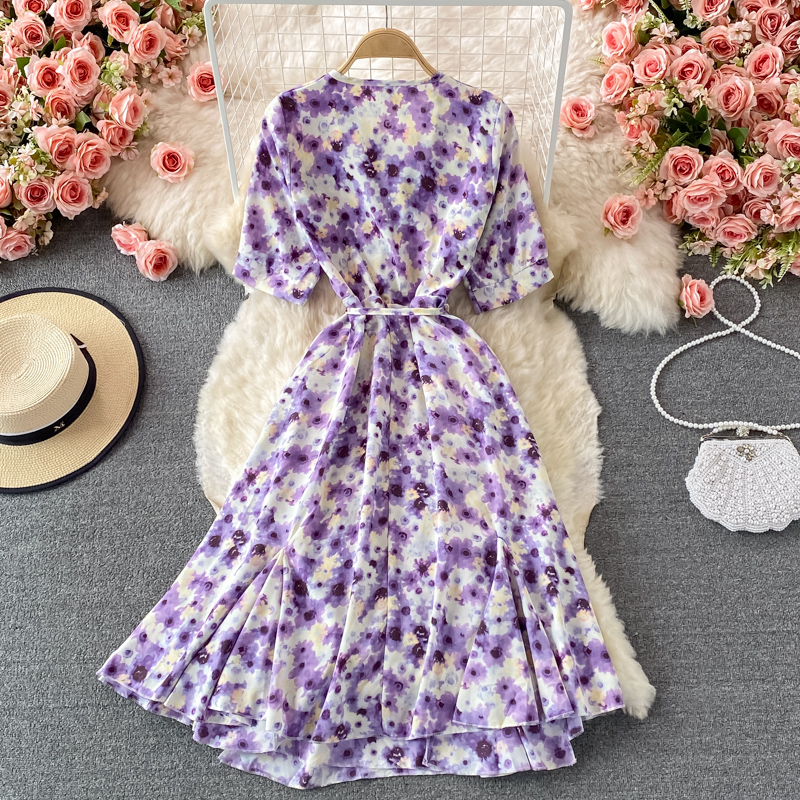 Cheap Dresses, Buy Quality Women’s Clothing Directly from China Suppliers:French Tea Break Puff Sleeve First Love Retro Purple Floral Skirt Mid Length Ruffled Chiffon V neck Dress Summer