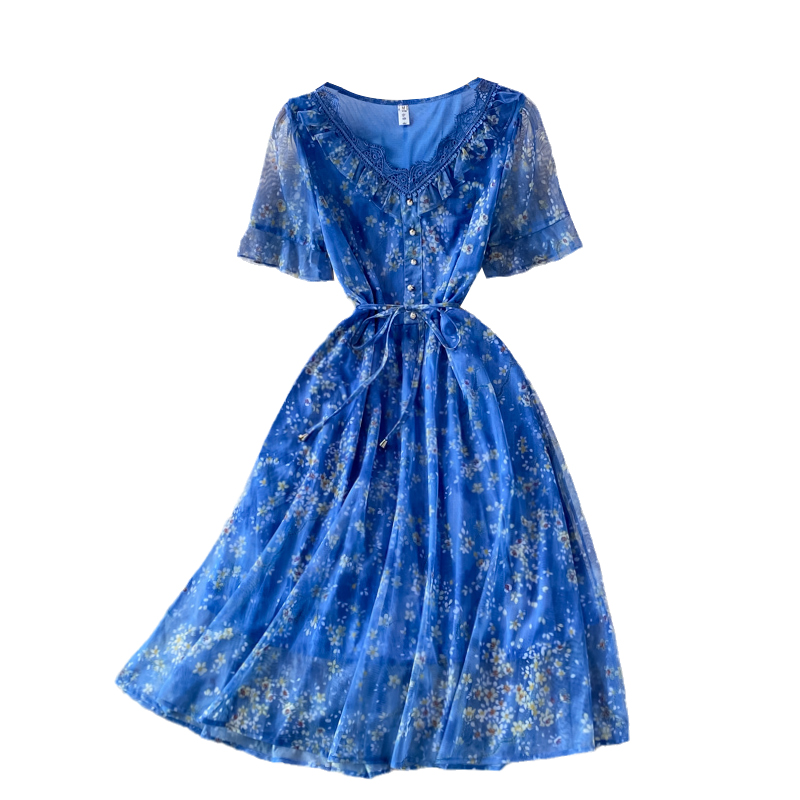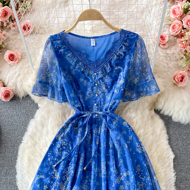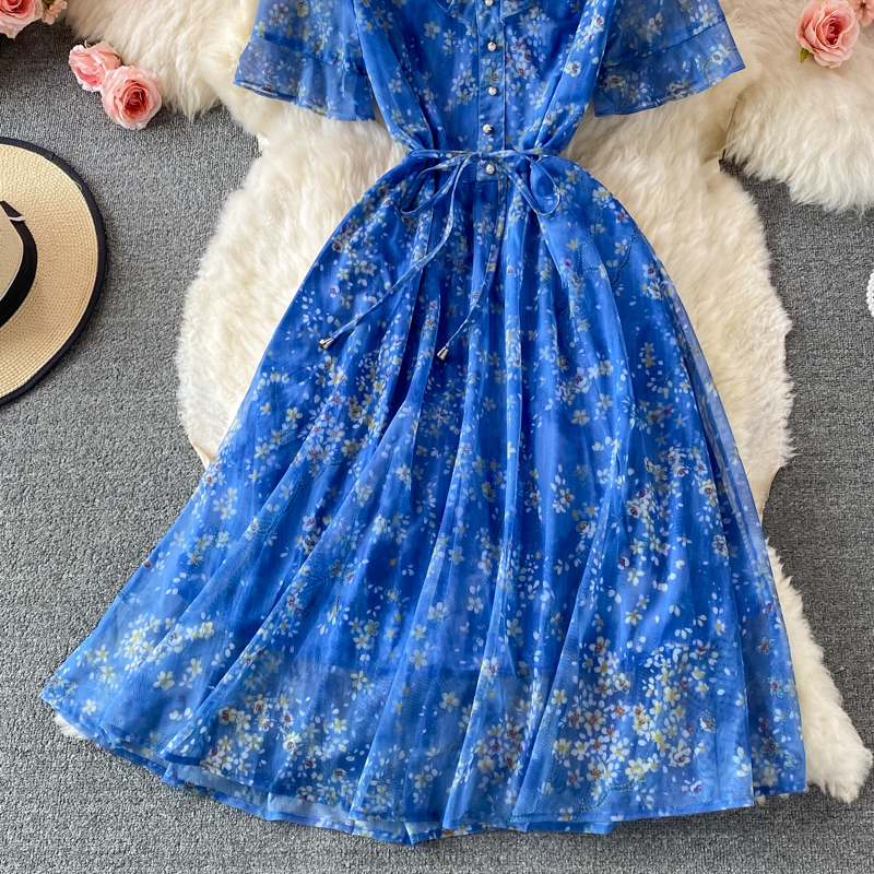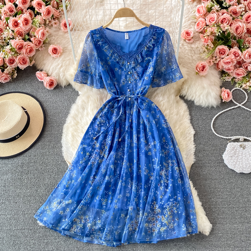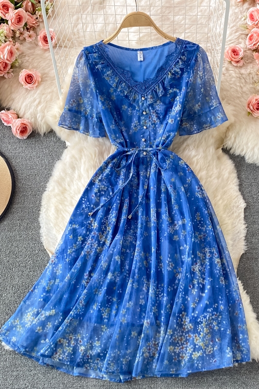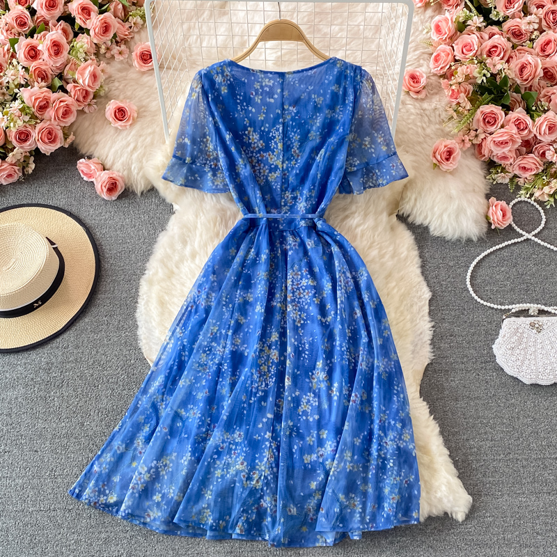 Cheap Dresses, Buy Quality Women’s Clothing Directly from China Suppliers:Bell Sleeve Floral Chiffon Dress Summer New Korean Style V neck Ruffled over the Knee Style Mid Length A line Skirt