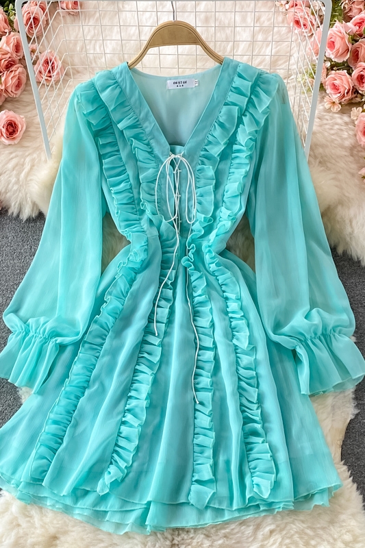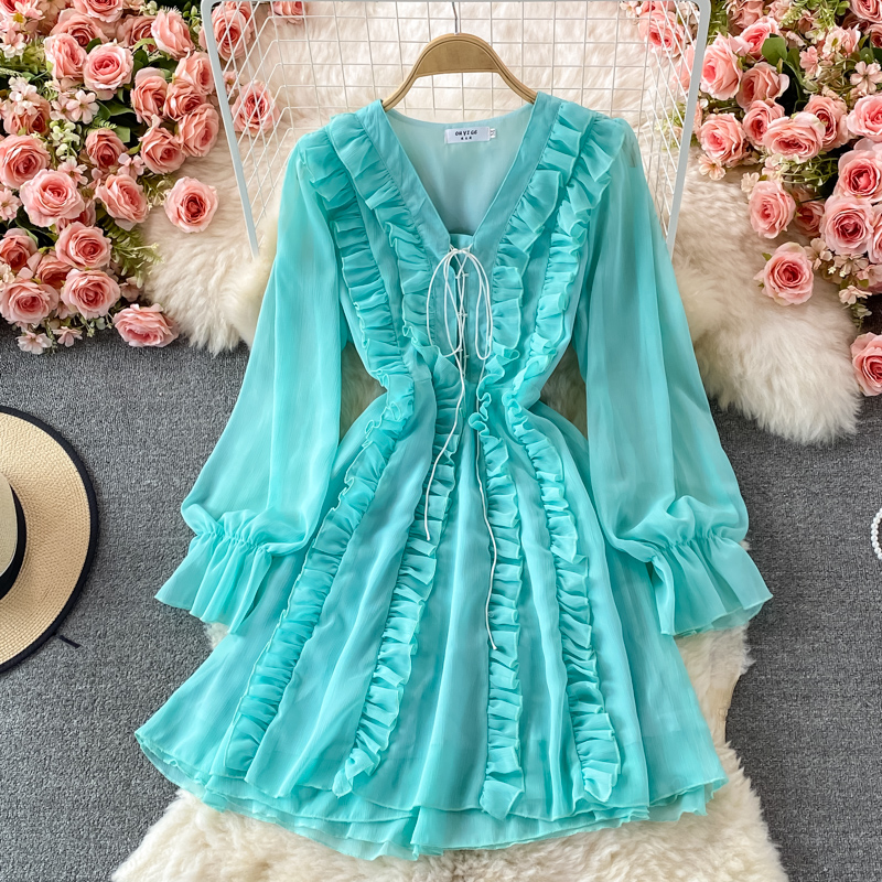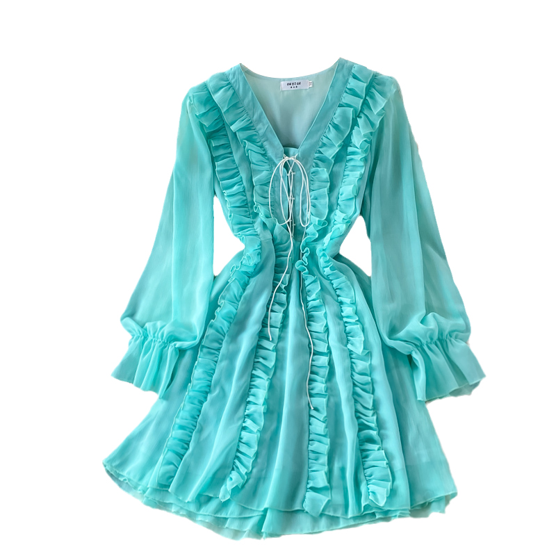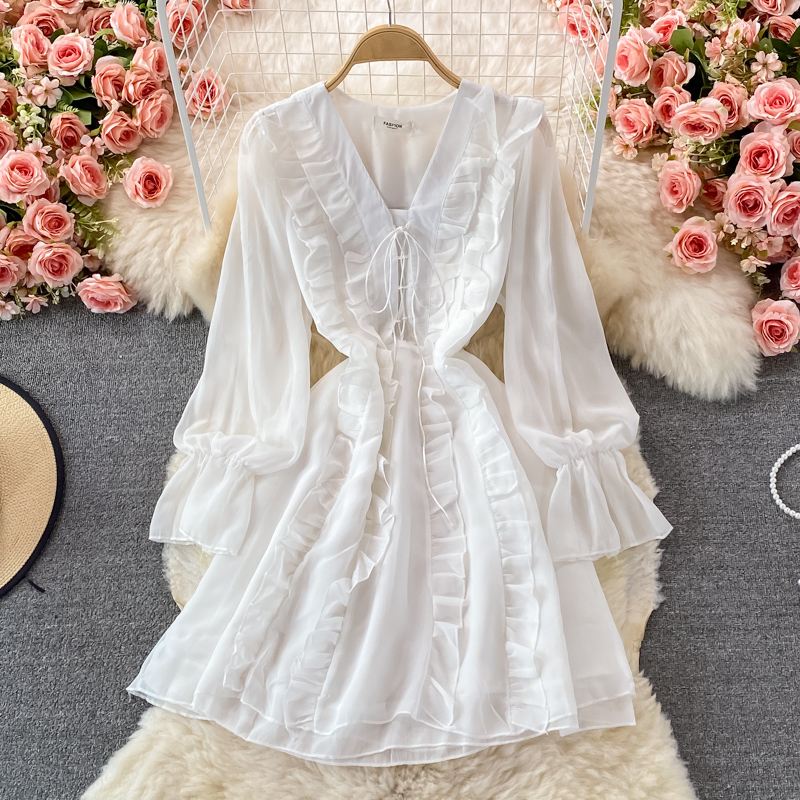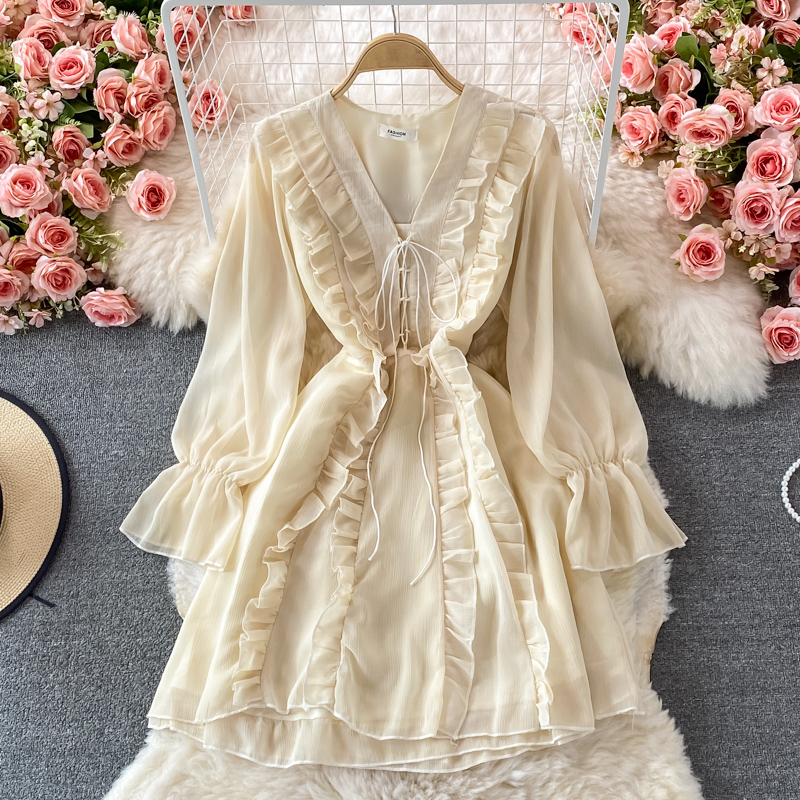 Long Sleeve Ruffled V-neck Dress Autumn New French Style Gentle Fairy Lady Super Fairy Mori Style Mid-Length A- line Dress