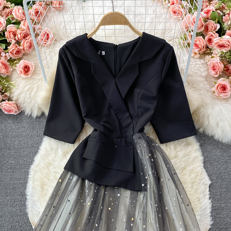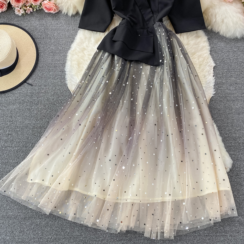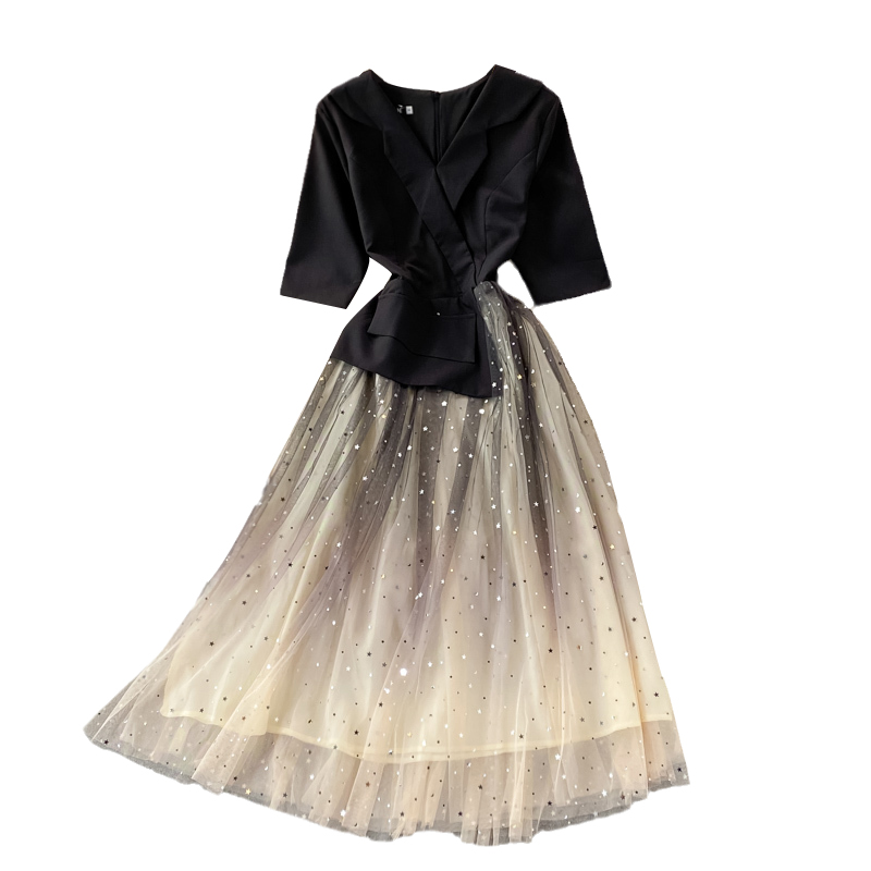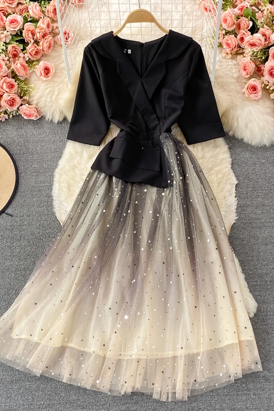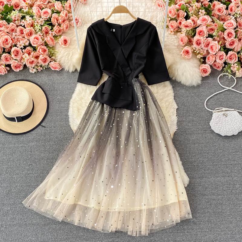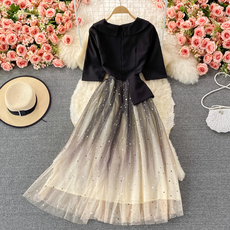 Autumn New Banquet Evening Dress Tight Waist Slimming Fairy Style Starry Sky Gradient Tailored Collar Dress Short Sleeve