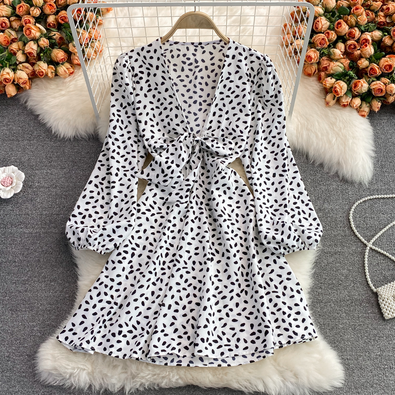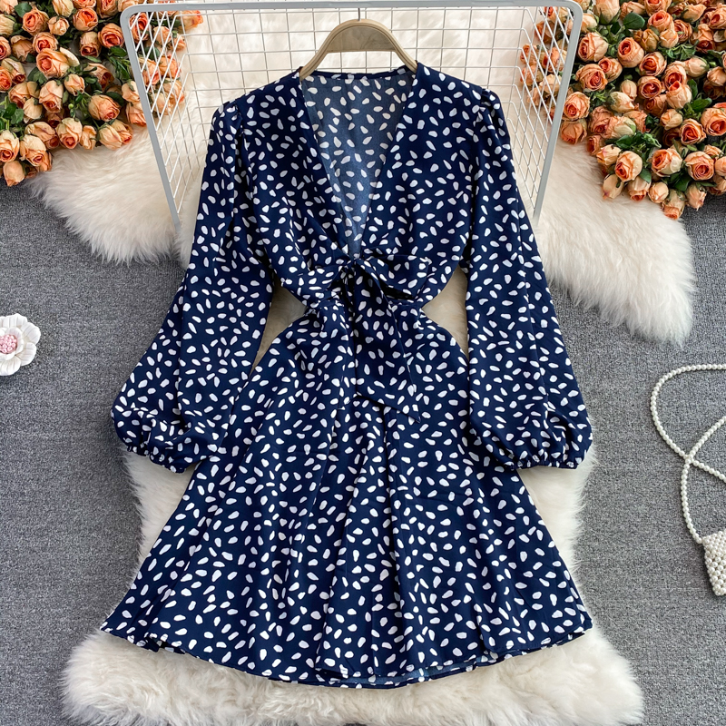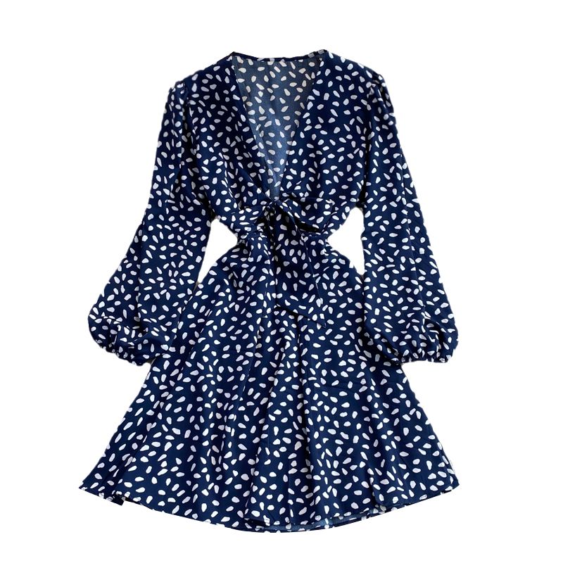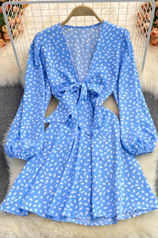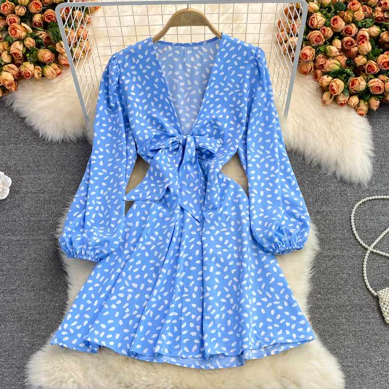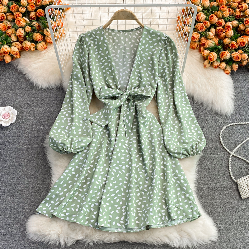 Cheap Dresses, Buy Quality Women’s Clothing Directly from China Suppliers:Fall European and American New Loose Mid Length Puff Sleeve Sweet Bow Bandage Deep V neck Dress Long Sleeve