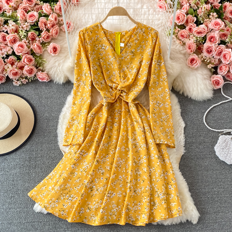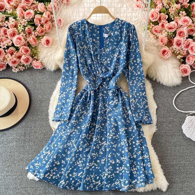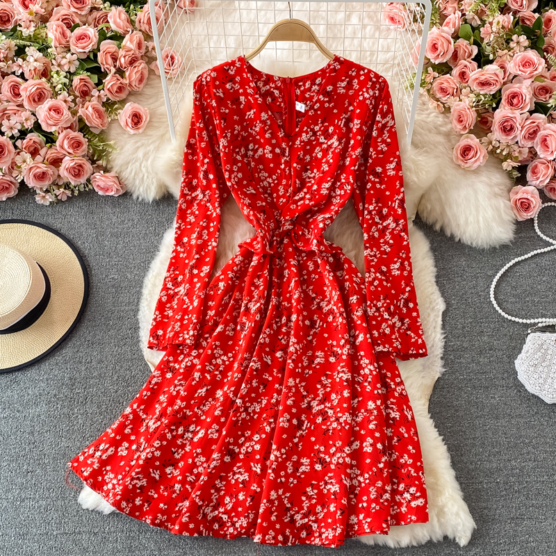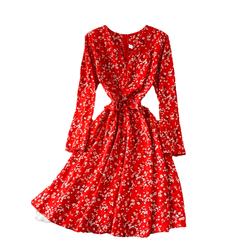 Cheap Dresses, Buy Quality Women’s Clothing Directly from China Suppliers:Fallnew French Style Vintage and Little Fresh Floral Skirt Waist Slimming Elegant V neck Chiffon Dress