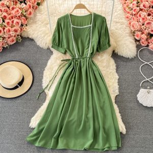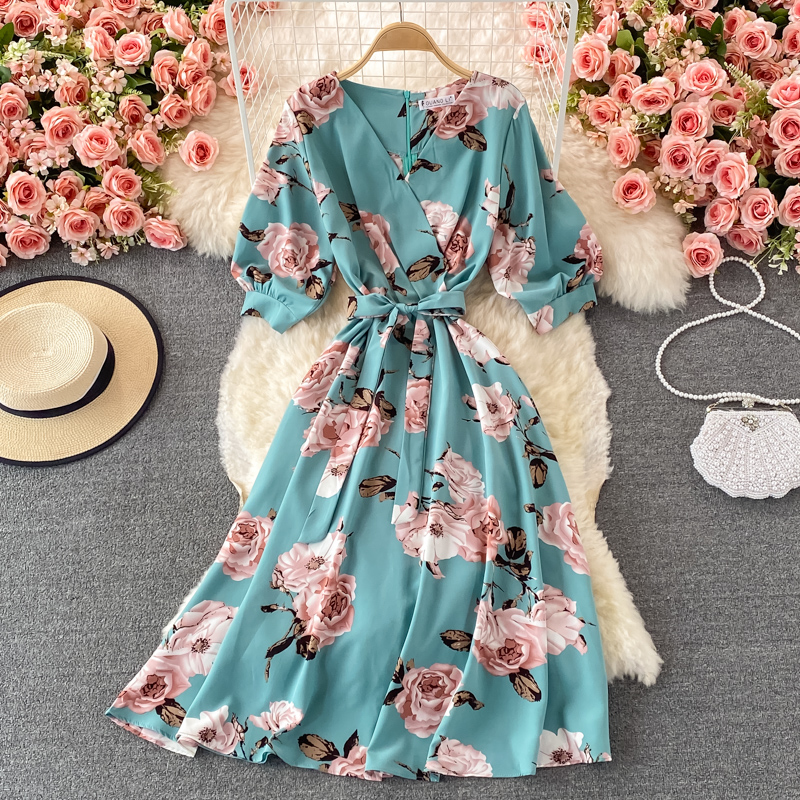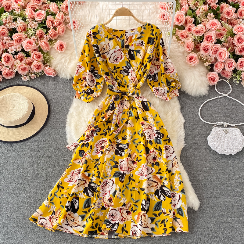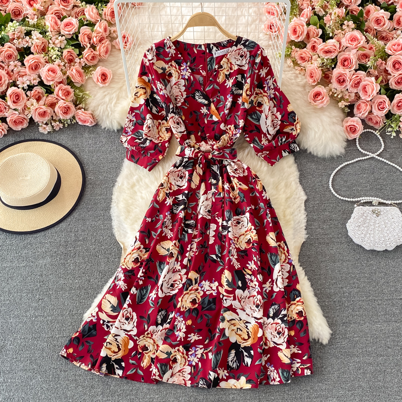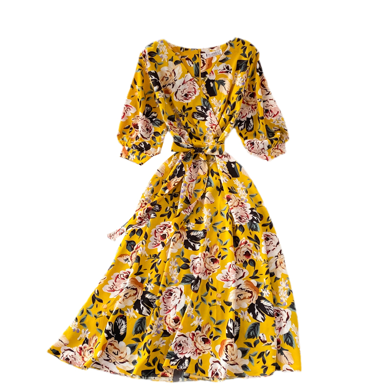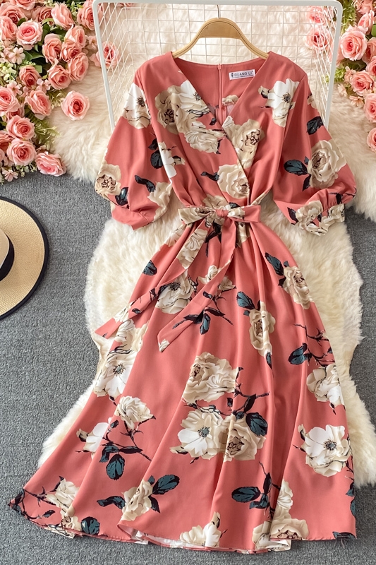 V-neck floral dress female summer new style loose cover belly Yujie style over the knee a-line big dress