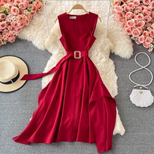 French round Neck Dress Summer New Temperament Commute Tight Waist Slimming Retro over the Knee Irregular Swing Long Dress