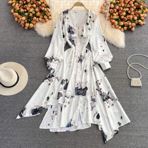 French ink painting square neck dress autumn new light mature wind irregular temperament long sleeve waist waist dress
