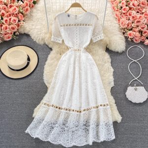 French round Neck Lace Dress for Women Summer New Fairy Lady Super Fairy Mori Style Waist-Tight Slimming Elegant Long Dress