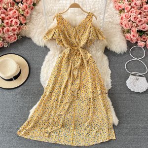 French Gentle V-neck Waist-Controlled Slimming Elegant Ruffle Dress with Short Sleeves Elegant Long Dress