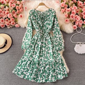 French round Neck Chiffon Dressautumn New Gentle Mid-Length Waist Trimming Ruffles Floral Skirt