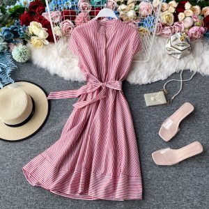 French Retro Red Striped Lightly Mature Dress Short Sleeve Women’s Summer Small Waist Slimming Temperament Short Skirt