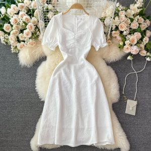 French open back white square neck dress short sleeve summer high waist slimming temperament slim first love dress long skirt